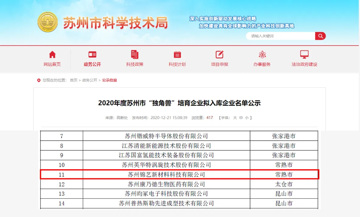 Recently, the Science and Technology Bureau of Suzhou City announced the list of companies included in the 2020 Suzhou Gazelle Plan. Suzhou Jinyi New Material Technology Co., Ltd. was included in the list of companies to be included in the 2020 Suzhou Unicorn Cultivation Project.